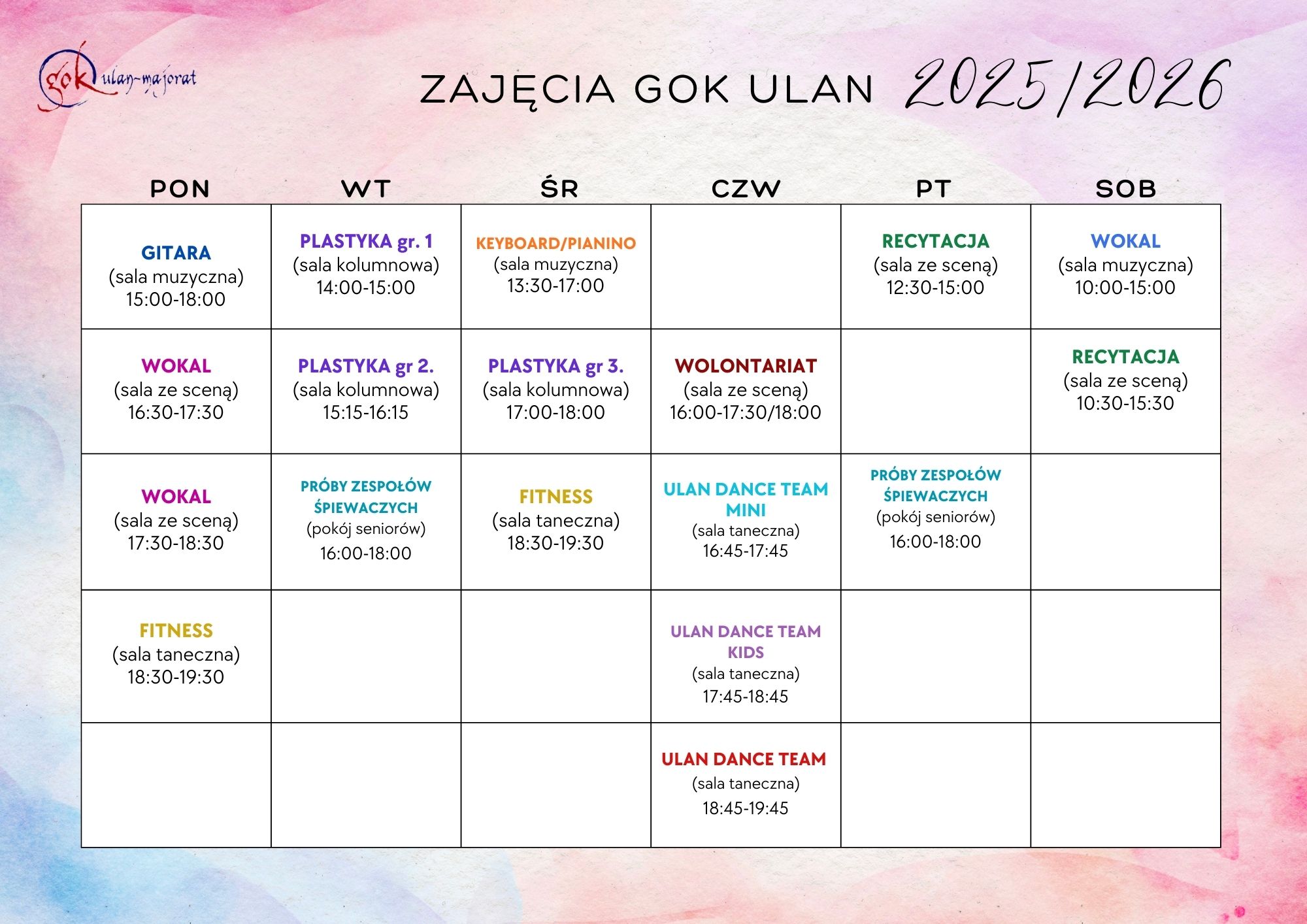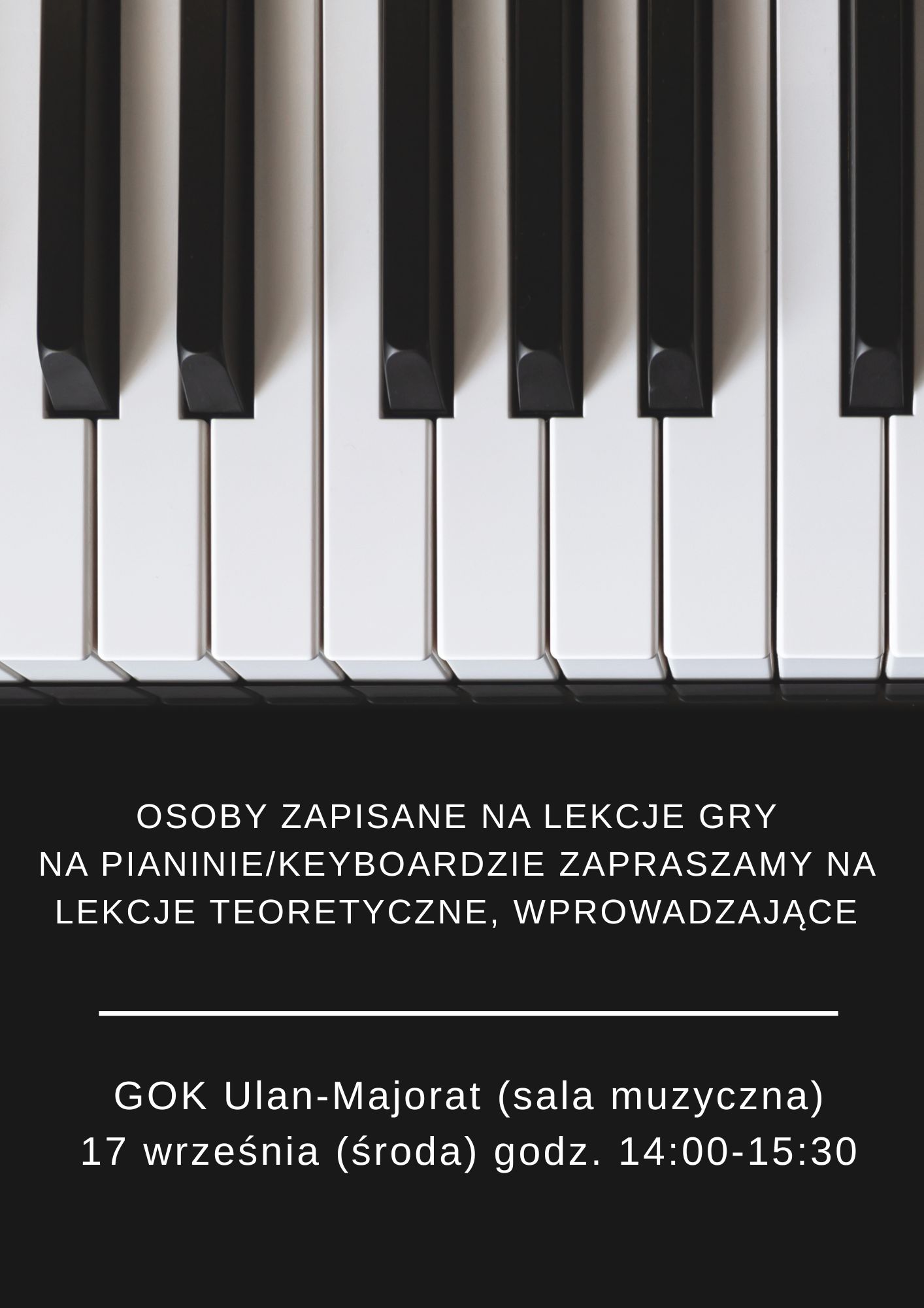 Osoby zapisane na lekcje gry na pianinie/keyboardzie zapraszamy na zajęcia wprowadzające 17 września o godz. 14:00 (sala muzyczna GOK-u) Na lekcje należy zabrać ze sobą:– zeszyt w kratkę formatu A4– zeszyt do nut – długopis, ołówek, gumkę– wodę do picia Zapraszamy!